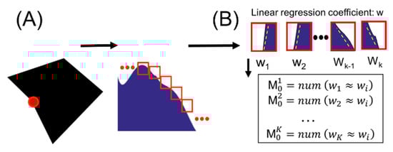 Here, we denote the number of similar windows as . Likewise, by comparing the w value of the second window and those of the other windows, the number of windows similar to the second window is determined and written as . Thus, we can obtain , , …, (Figure 3B) where K is the number of windows. In the preliminary study, when we took c ≥ 0.95, the number of windows with the same slope was too small to calculate the self-similarity. On the other hand, when the c value was set too low (≤0.65), the number was too high, and it was difficult to trust the value. For this reason, we chose a c value of 0.8. Similarly, for φ values, we tested for 5, 10, 15, and 20, and all four cases showed statistically the same results. The φ value may need to be changed depending on the complexity of the shape, but it was sufficient to take lag = 20 for the shapes used in this study. After obtaining the set of {, ,…, }, we also consider the cyclic shift of window by φ. Similarly, we define the number of windows similar to the i-th window as for i = 1, …, K. The set of {, ,…, } can then be extended to the following matrix: