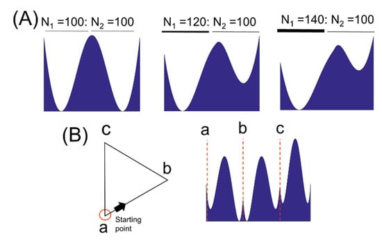 When N1 = N2, the entropy profile was exactly symmetric. However, in the case of N1:N2 = 120:100, the entropy profile was relatively high in the region of low node density. For the case of N1:N2 = 140:100, the entropy profile tended to rise further in regions with lower node density. This can be illustrated through the example shown in Figure 1. When a node on a straight line with a low node density is connected to nodes on a straight line with a high density, the dispersion of its length distribution is reduced compared to the opposite case. To see if this density effect is also apparent in shape, we draw a triangle with three straight lines of the same length and different node densities (Figure 4B). The red circle represents the starting point of the entropy profile. The line formed by the two points a and b had 100 nodes, and the line consisting of points b and c and a and c had 120 nodes, respectively. The entropy profile was clearly higher in straight lines a–b with lower node density.
