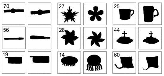 To assess the visual similarity of two shapes with similar Γ values from a geometric point of view, we computed the Γ values for 1400 shapes in the shape database (MPEG-7) []. The computer hardware used for the computation had an Eight-core processor (3.6GHz) and RAM (32GB), and the software was MATLAB R2019a. The time taken to obtain the final result was approximately 4 h. The MPEG-7 database consists of 70 different object groups (20 shapes in each group). Subsequently, we performed one-way ANOVA and post hoc (Duncan) tests (Table 1). In Table 1, N, M, and G denote object groups, the average value of Γ, and statistical similarity indication, respectively. Considering the values of M and G, there were groups that belong to the same set with high M values, while there were also sets that are bound with low M values and sets that are loosely bound (e.g., N = 24, 47, 52, 65). The loosely bound groups appeared at levels where the M value was not too high or too low. This indirectly means that the shape classification from the Γ point of view is somewhat different from the existing method of simply classifying from the geometric point of view. Groups 19, 56 and 70 were statistically identical to each other with relatively high Γ values. The shapes belonging to these groups had the characteristic of being long in one direction and were visually similar (Figure 5). Conversely, groups 14, 27, and 28 had relatively low Γ values and were statistically equal to each other. The shapes belonging to groups 27 and 28 were visually similar to each other, and the shapes in group 14 were significantly different visually from those in the two groups.