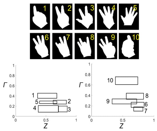 Figure 6 shows a typical finger gesture shape that represents a number from 1 to 10 and shows the mean and standard deviations of the Γ and Z values of the shapes that belong to each number group. Gesture shapes that symbolize the numbers 1 to 5 are made by showing the back of the hand, while gestures that represent the numbers from 6 to 10 are implemented by showing the palm. Using loci coordinates of the little finger (pinky) and the longest finger (middle finger), we can easily distinguish between 1–5 and 6–10. In the lower figures, the center coordinate values of the square are the mean values of Γ and Z, respectively, while the width and height of the square represent the standard deviation values of Z and Γ, respectively. The lower left figure shows the results for a finger shape representing the numbers 1 to 5 (see the number next to each square), while the lower right figure shows the results for a finger shape representing the numbers from 6 to 10. In each figure, the squares were well separated from each other. This means that Z and Γ can be useful for resolving finger gesture recognition challenges.