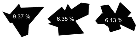 For Section 3.2, researchers have conducted a study on the MPEG-7 shape database to classify 70 objects with various approaches. Largely, there are classifications using contour-based and region-based shape descriptors []. Also, contour-based descriptors can be divided into structural descriptors (e.g., chain code, polygons, Gaussian smoothing invariants) and convention descriptors (e.g., Fourier descriptors, perimeters, compactness). In the study of Zhang and Lu (2003) [], the contour-based descriptor showed an accuracy of over 86.4% on average, while the region-shape descriptor showed an accuracy of over 76.5%. Some showed an accuracy of 95.0% or more depending on the type of descriptor. In recent years, fusion methods using artificial neural networks have been used to further improve the performance []. The existing methods mentioned above aim to improve classification accuracy. On the other hand, our method is not aimed at high classification accuracy, but rather shows which shapes are grouped according to the level of the Γ value. As shown in Figure 5, shapes belonging to statistically similar groups with high Γ values had visually similar characteristics, while shapes belonging to statistically identical groups with a low Γ value were geometrically similar or different. However, they were all somewhat similar topologically. In this respect, the existing method and our method cannot be directly compared in terms of the classification performance accuracy. Grouping shapes with a certain level of Γ value would allow us to select shapes that appropriately contain both geometric and topology information. From this point of view, it would be mathematically interesting to explore the relationship between the information and Γ values.