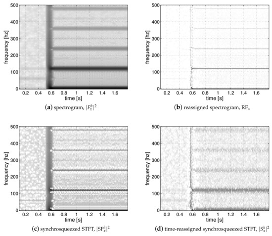 - Auger, F.; Flandrin, P. Improving the readability of time-frequency and time-scale representations by the reassignment method. IEEE Trans. Signal Process. 1995, 43, 1068–1089. [Google Scholar] [CrossRef]