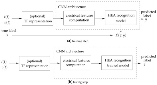 Here, we propose to apply a CNN to the task of HEAs recognition under the assumption that a TF representation conveys a sufficient amount of information valuable in learning useful features. Despite electrical features computed from current and voltage signals frequently being designed and analyzed for HEAs’ identification [9,31,32], we expect that the CNN is able to autonomously learn new features based on relevant patterns present in the data. In our study, we compare two distinct inputs which require dedicated CNN architectures: