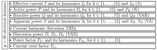 In our previous work [15,19], we introduced a set of 90 features, summarized in Figure 3, which are based on the latest IEEE 1459-2010 standard for the definition of single phase physical components under non-sinusoidal conditions [26,27]. Among the 90 proposed features, we selected 34 related to the active and the reactive power (respectively denoted P and Q) which satisfy the additivity criterion defined in [28]. This property is required for allowing a disaggregation of the mixture signal resulting from several HEAs simultaneously activated before performing the individual HEA recognition process. To this end, an event detection method such as [19] can be used to separate the distinct contribution when several HEAs are switched on simultaneously. In [15], the proposed features are computed for each voltage period and are derived from the Fourier coefficients corresponding to the 15 first harmonics of the voltage frequency. In the present study, we extend the feature definition using the STFT of the discrete-time sampled signals approximated by: and , as detailed below.