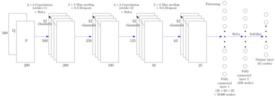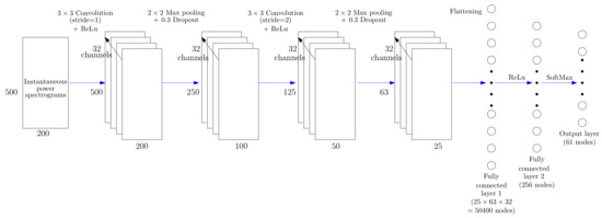 The CNN architecture depicted in Figure 4 uses as input the TF representation computed from the instantaneous power signal given by Equation (28). This input layer is connected to four blocks of 32 convolutional neurons with a kernel and a REctified Linear Unit (ReLU) activation function followed by a dropout layer and a max-pooling layer. The last hidden convolutional block is connected to two hidden fully connected layers followed by a softmax activation function which produces the final output with the same dimension as the number of expected classes (61 classes considered in this study). Each output node corresponds to the confidence score obtained for each input data. The classification decision rule consists in selecting the HEA class label which obtains the maximal confidence score.