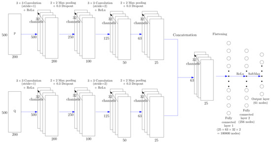 Concatenated CNN architecture used in this research work. The input corresponds to one channel of active power (P) TF representation and one channel of reactive power (Q) TF representation.