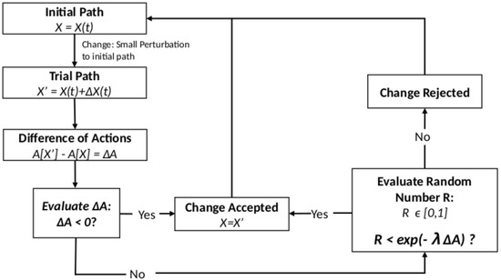 The Monte Carlo Metropolis (MCM) implementation is usually employed for sampling a multidimensional space governed by a probability distribution [5,6]. The following MCM implementation is used for sampling the path space governed by a probability functional obtained via MaxCal. This procedure makes it possible to find the minimum action path.