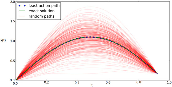 In this case, the least action path also converges to the analytical solution, correctly solving the equation of motion as shown in Figure 3. For this simulation, five control points were used and were sufficient to obtain the exact result () in less than 10,000 Monte Carlo steps.