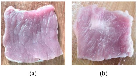 Figure 3 shows the diagram of the HIFU experimental system. Before the HIFU experiment, povidone and 95% alcohol were mixed at a ratio of 1:4. Then, the mixed solution was mixed with water at a volume ratio of 1:20 and took one hour to remove oxygen from the water to obtain oxygen-free water. The sizes of the porcine muscle tissue samples in vitro were prepared as 60 × 55 × 50 mm. Then, all the porcine muscle tissue samples in vitro were degassed to prevent it affecting the experimental results. The target region of the fresh porcine muscle tissues in vitro was irradiated by a HIFU transducer (PRO2008, Shenzhen, China) with a center frequency of 1.39 MHz to change the biological tissue characteristics. At the same time, the temperature of the HIFU-irradiated porcine muscle target region was measured by a thermometer. After turning off the HIFU ultrasound probe, B-mode ultrasonography (SSI-5500, SonoScape, Shenzhen, China) was used to monitor the treatment process of HIFU and the sampling frequency of the ultrasound probe was 20 MHz. A fiber optic hydrophone was used to obtain the B-mode ultrasonic scattered echo signal. Then, the signal was converted into a digital signal by a digital oscilloscope and saved in the PC. In this HIFU experiment, 300 ultrasonic scattered echo signals of normal and denatured tissues were collected (including 150 cases of normal tissues and 150 cases of denatured tissues). Figure 4 shows the pictures of normal tissue and denatured tissue in vitro.