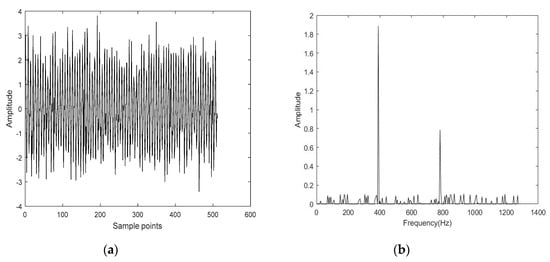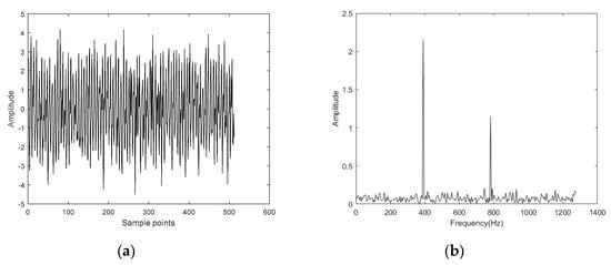 The time-domain waveform and frequency spectrum of the simulated signal are shown in Figure 5. Then, Gaussian white noise was added to the simulated signal so that the signal-to-noise ratio of the noisy simulated signal was 5 dB. The time-domain diagram and frequency spectrum of the noisy simulated signal are shown in Figure 6. The noisy simulated signal was analyzed by CS. The methods of L1 norm and OMP were employed to reconstruct and obtain the denoised signals, respectively. The time-domain waveform and frequency spectrum of the denoised signals are shown in Figure 7 and Figure 8. It can be observed that the time-domain waveform and frequency spectrum of the denoised signal obtained by the OMP reconstruction method was closer to that of the simulated signal. The denoised signal obtained by the L1 norm reconstruction method contained more noise components. The denoised effect of the OMP reconstruction was obviously better than that of the L1 norm reconstruction.