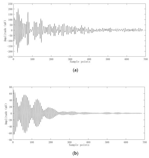The CS-OMP method was used to denoise the actual ultrasonic scattered echo signal. The waveform of the ultrasonic scattered echo signal before and after denoising is shown in Figure 9. It can be clearly seen that the denoised signal has obvious pulse waveform, and the waveform shows oscillation attenuation.
