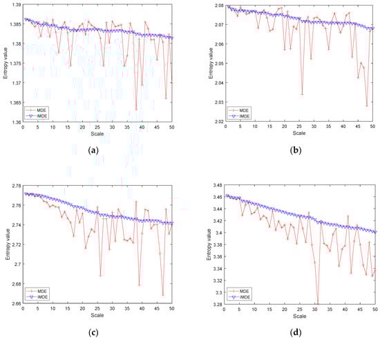 To illustrate the advantages of the IMDE method, white Gaussian noise of 5000 data points was generated as the simulated signal. According to the published reports [,], we chose the number of categories as 2 and the delay time as 2. The MDE and IMDE of the simulated signal were calculated when the embedding dimension was 4, 5, 6, and 7, respectively. The results are shown in Figure 10. It can be clearly seen from Figure 10 that both MDE and IMDE show an overall downward trend with the increase in scale factors. However, the value of MDE fluctuates significantly with the increase in scale factor, which reduces the stability of multiscale entropy. The value of IMDE fluctuates less and has better stability, which means that the improvement in the coarse-grained process is effective.