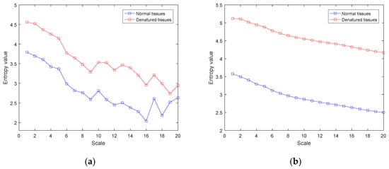 The MDE and IMDE methods were used to calculate the entropy value of the ultrasonic scattered echo signals after CS-OMP denoising. The results are shown in Figure 11. It can be clearly seen from Figure 11 that the MDE and IMDE values of the ultrasonic scattered echo signals of the denatured tissue are higher than that of the normal tissues. Both MDE and IMDE can distinguish normal tissues and denatured tissues in vitro. However, compared with the MDE, the IMDE curve of ultrasonic scattered echo signals is smoother and more stable. The difference in IMDE between normal and denatured tissues is more obvious at different scales.