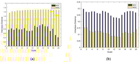 The interclass distance and intraclass distance of MDE and IMDE within different scale factors. (a) Interclass distance of MDE and IMDE within different scale factors; (b) Intraclass distance of MDE and IMDE within different scale factors.