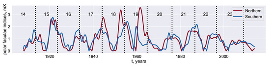 Polar faculae data for northern (blue curve) and southern (red curve) hemispheres.