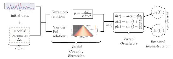 The Kuramoto and VdP models give the two ways of the reconstruction of the coupling exhibited by (8) and (12) respectively. The dynamics of the reconstruction is inferred from the time series and considered as the input when restoring coupling under the assumption of the quasi-stationarity of the solutions. We add into the consideration the dynamics of the differential equations by generating a new series. The full reconstruction procedure is displayed in Figure 3. It consists of the following steps.