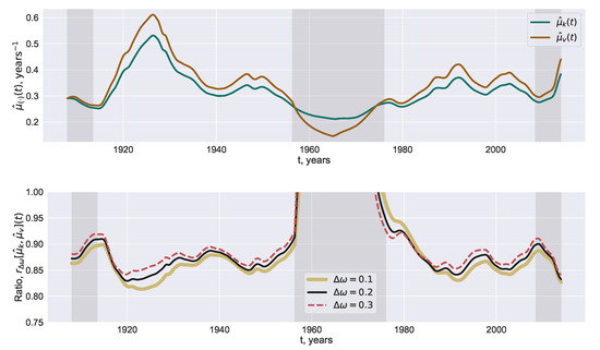 Then one can assess the phase difference between the oscillators assuming that is constant, but varies. We choose as a “typical” value of and restore which results in this . The evolution of the restored interpreted as the normalized phase frequency associated with the northern component of the polar magnetic field is shown in Figure 6. Small values of in the late 1950s and around 1916 are observed (Figure 6) approximately 7–10 years prior to the changes in the leadership of the oscillators representing the northern and southern solar hemispheres (see Blanter et al. [11] and Deng et al. [36] for the discussion regarding the changes in the leadership and the time of their occurrence). The leadership of the northern hemisphere were ceased to exist in the 1920s and recreated in the 1960s. The second change is known to be much stronger. Since each restored value is obtained with the 22-years data centered at this t, these small values of are constructed with the data which represent the changes in leadership. Our rough way to restore the natural frequencies failed at the time of this strong change in the leadership and resumed its functionality in the mid 1980s when the phase difference returned to usual values (Figure 6). A downward trend at the right part of the graph in Figure 6 may also attain values of the 1920s and 1960s, but with the data at hand only the level of the 1940s is reached.