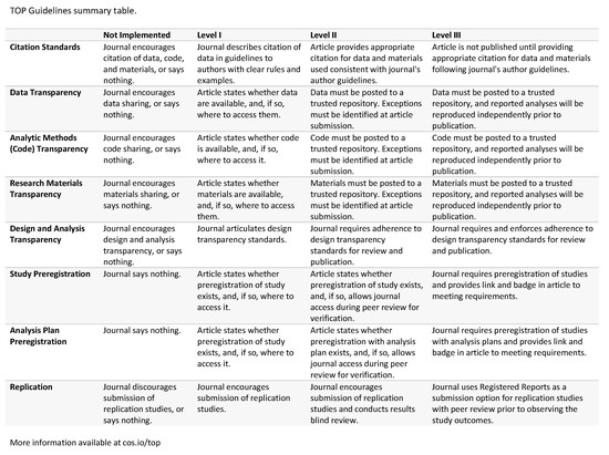 Summary of the eight standards and three levels of the guidelines organized by the Transparency and Openness Promotion (TOP) Committee meeting at the Center for Open Science in Charlottesville, Virginia, USA, in 2014 [44]. This guideline is Version 3 of 2018 available at http://cos.io/top.