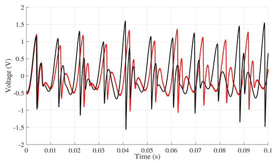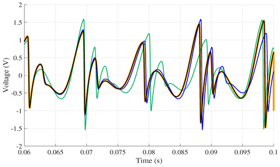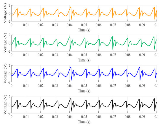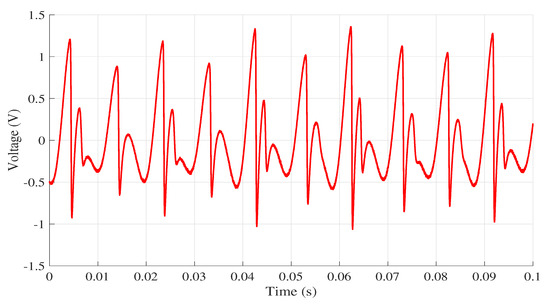 The jerk circuit was simulated in LTspice XVII on the four computers listed in Table 2. The same version of the software was used in all computers. Then, the data from the physical circuit were collected using the data acquisition board. As mentioned earlier, to ensure that all simulations on the circuit started from the same initial condition as the experimental circuit, the first value obtained in practice was used, so the initial condition for all simulations was . All results were collected in the time interval within 0 and 0.1 s. The signal collected in the practical experiment is shown in Figure 5, while Figure 6 presents the response to voltage collected at the point for each computer.