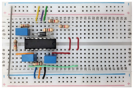 - Simulation and data collection of the electronic circuit scheme in different computers as described in Table 1. The implementation in a board is shown in Figure 3.