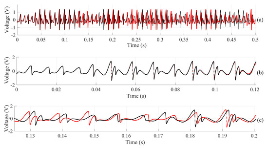 To make a more improved analysis and better check the reproducibility of chaotic circuit simulations in SPICE software, the same jerk circuit was simulated, with the same conditions in two different versions of the LTspice software. It is important to note that the simulations took place on the same computer. The versions used were LTspice IV and LTspice XVII, and the simulations occurred in the time interval from 0 to 0.5 s. After collecting data from both software, the NRMSE index was calculated again, which can be seen in Table 6. Figure 8 shows the simulations of the two versions. In Figure 8a, we have the entire simulated time interval, and it is already possible to see the difference between the two simulations. Figure 8b shows the results only from the first moments. In Figure 8c, we have a time interval in which the results differ considerably, thus reinforcing the influence of the simulation time on the reproducibility of the results. It is possible to perceive that even simulating on the same computer, the fact of using different versions of the software also influences the reproducibility of the results. Sayed and Fahmy [101] also reported this problem when simulating the same system in different software.