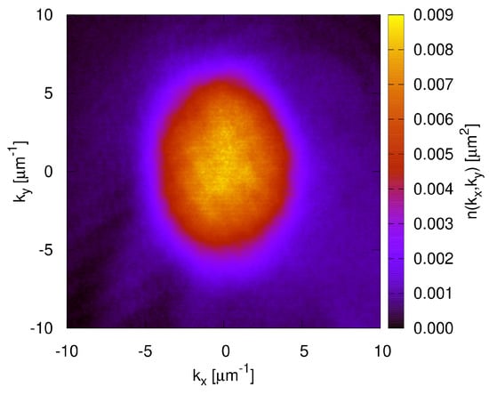 The optical absorption image of the cloud after the TOF produces an image on the plane , as illustrated in Figure 1. The momentum distribution is obtained by averaging the values within the interval and , with m. In the left panel of Figure 2, we show the result of this procedure for . However, the absorption image corresponds to a two-dimensional projection of the cloud, and we would like to work with the three-dimensional distribution. A procedure that has been successfully used in the past to overcome this difficulty [,] consists in employing the inverse Abel transform [], which reconstructs the three-dimensional distribution from its two-dimensional projection according to