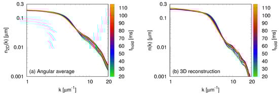 Momentum distribution of an unperturbed cloud () held in the trap for different times () from 20 to 115 ms. We show both (a) the angular average using the absorption images, and (b) the three-dimensional reconstruction of the momentum distributions using the inverse Abel transform, Equation (21). The profiles for different hold times are very similar, with small differences at high-momenta due to heating in the system.