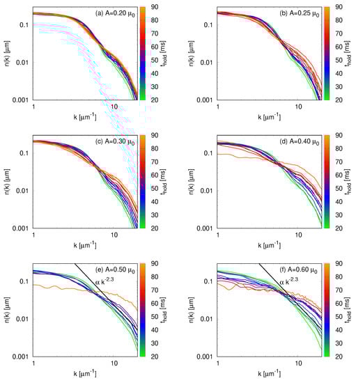 Momentum distribution of the cloud for the excitation amplitudes , 0.25, 0.30, 0.40, 0.50, and 0.60, panels (a–f) respectively, and holding times ranging from 20 to 90 ms. Increasing the excitation amplitude corresponds to larger energy input to the BEC, thus driving the system toward higher-momenta regions. For strong enough excitations, 0.50 in this experimental setting, the system enters a turbulent regime with a particle cascade characterized by a power-law . In panels (e,f), we plot a line corresponding to to guide the eye.
