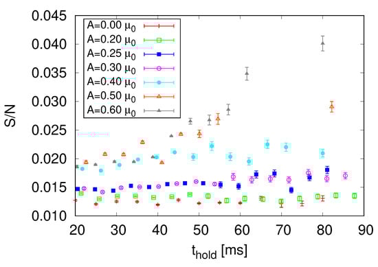 As the amplitude of the external excitation increases, so does the temperature of the cloud, the atom losses, and the depletion of the condensate. At ms, the number of atoms is close to for all amplitudes. For the longest holding times that we investigated, 90 ms, the atom loss never exceeds 20% for , and it is much more pronounced for the highest amplitude considered, 50%. The temperature of the cloud is ∼0.5 at ms, while, at ms it is close to for and approximately for . Finally, the condensate fraction is approximately 40% at ms (if the excitation protocol is employed) and it can drop to as low as 20% for the highest amplitude and ms.