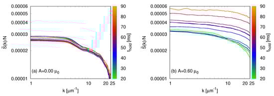Much of our understanding of turbulent systems comes from functions computed in the momentum space, such is the example of the momentum distribution. This is because they provide information on how particles and energy flow from one momentum class to the neighboring ones. We can define an entropy as a function of k by recasting Equation (16) as . We show our results in Figure 5 for 0 and 0.60, an unperturbed and a turbulent BEC, respectively. The sudden increase in the entropy is also evident in Figure 5b, as the distributions for 45 ms are close together and for longer times they continue to increase. Thermalization occurs for long times for the turbulent BEC, and it corresponds to a more flat distribution.
