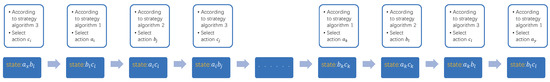 Algorithm 5 can be considered as a multi-stage decision process optimization problem which is shown in Figure 2. The action spaces of the third, fourth, and fifth step in Algorithm 5, which are the optimization problem of Algorithms 2–4, are set to , , and where , , are limited and denoted as set A, B, and , respectively. It can be seen in Figure 2 that the state spaces of the third, fourth, and fifth step in Algorithm 5 are the Cartesian product of the other two action spaces and the state spaces size are , and , respectively. The state transition equation refers to the transition probability from state to state conditioned on taking action . The state transition probability is written as , where , and . We assume with the condition that there is no interference in the transition process, so the transition probability here is 1. If the multi-stage decision-making process is a closed loop that or or exists, Algorithm 5 is stable. Since , , and are all bounded, or or appears at most transitions during the whole stage. Therefore, it indicates that Algorithm 5 is stable. In Section 6, Figure 6 further illustrates that Algorithm 5 converges to a near optimal solution.