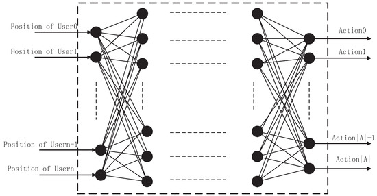 In subsection B, the TQL algorithm solves the problem of action space dimension explosion. In order to have the ability to classify the state for the agent, a DNN whose structure is shown in Figure 3, in which there are two hidden layers and each hidden layer has 512 nodes. The activation function for each hidden layer is a rectified linear unit (ReLU), and ADAM (adaptive moment estimation) [36] is utilized as updating algorithm and learning-rate is equal to 0.001. The optimal strategy of TQL is to label the samples and specify optimal action in each state. Samples are the set of users position which are gathered from TQL algorithm. The input is the location information of users and the optimal action is encoded according to the index in the action space as the output.