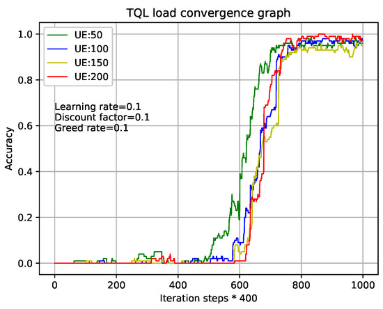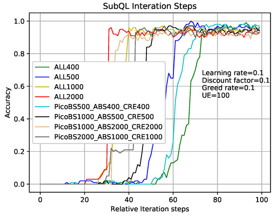 Figure 7 shows that the comparison of sub-QLs (Algorithms 2–4) iterations in the TQL algorithm give different results where relative parameters are the same as that in analysis of Figure 5 and the number of users is 100. Take the greed line and red line as examples which indicate the number of sub-QL iterations of SBSs ( in Algorithm 4), ABS ( in Algorithm 2), and CRE ( in Algorithm 3) are all set to 400 and 2000, respectively. When the iteration number of TQL represented by the green line and red line is more than about 75 and 30, our proposed TQL algorithm is convergent, but the final accuracy rates are about 98% and 90%, respectively. We can see that, although the convergence speed respected by green line is relatively slower, the final correct rate is higher and the performance is better than that respected by the red line. Our proposed TQL algorithm can make a balance between performance and convergence speed according to actual requirements by adjusting the iterations of the subsystems such as the black line indicated case where the numbers of sub-QL iterations of SBSs, ABS, and CRE are set to 1000, 500, and 500, respectively. The number of iterations for TQL represented by cyan line is more than about 50 and the final correct rate is about 93%.