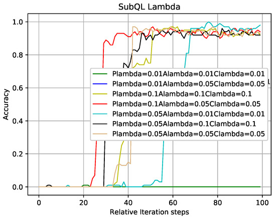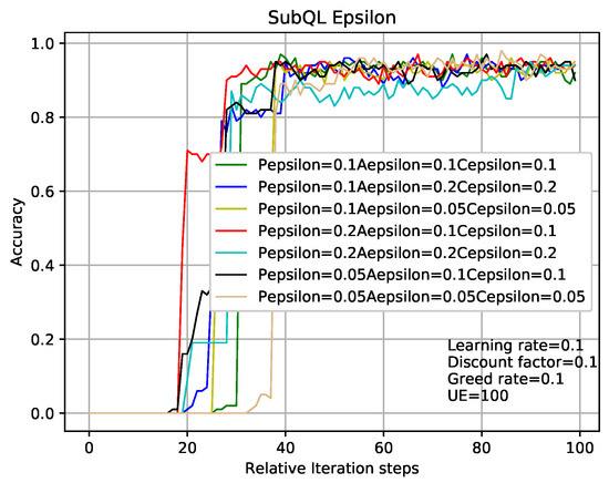 In the case where other experimental parameters the same as that in analysis of Figure 7 and Figure 8, the methods of analyzing Figure 9 and Figure 10 are like that in Figure 7 and Figure 8. The results obtained from Figure 7, Figure 8, Figure 9 and Figure 10 are that the balance can be obtained between performance and convergence speed by changing the corresponding parameters of the sub-QL in our TQL algorithm. It can be seen that our TQL algorithm has greater flexibility in parameter adjustment compared to the general system where only one set of parameters is set.