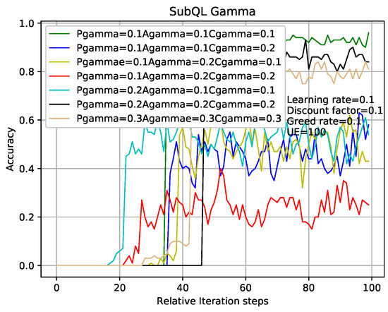 In the case where other experimental parameters are the same as that of Figure 7, Figure 8 shows the influence of different learning rates of sub-QL algorithms on convergence speed and correct rate. Take the red line and the cyan line as examples which indicate that the learning rates of sub-QL of SBSs, ABS, and CRE are set to 0.1, 0.05, 0.05 and 0.05, 0.01, 0.01, respectively. We can see that, when the iteration numbers of TQL respected by the red line and cyan line are about 30 and 70, our TQL algorithm is convergent and the final accuracy rate are about 95% and 99%, respectively. The convergence speed respected by the red line is faster than that respected by the cyan line, but the final accuracy rate is otherwise. Pay attention to the problem caused by the setting learning rates respected by the green line which are all set to 0.01, if the learning rate is set too low, the system falls into the local optimum, and the global optimum cannot be found. It is easy to make this mistake in the RL.