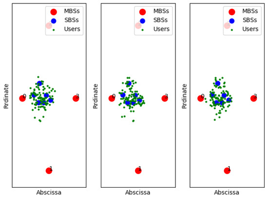 Figure 11, Figure 12 and Figure 13 show examples of the sample classification of our designed DNN when the ABS, CRE, and the number of SBSs activations are set to (0, 0, 6), (3/8, 6, 6) and (7/8, 18, 6), respectively. The labeled samples are obtained from the optimal strategy of TQL algorithm, in which 90% of them are training samples and the rest are test samples. The red dots represent the macro base stations where the macro base station with the number 0 is the cell signal source, and the macro base stations with the other numbers are the interference signal sources. Blue and green dots indicate the location of SBSs and users in the cell, respectively.