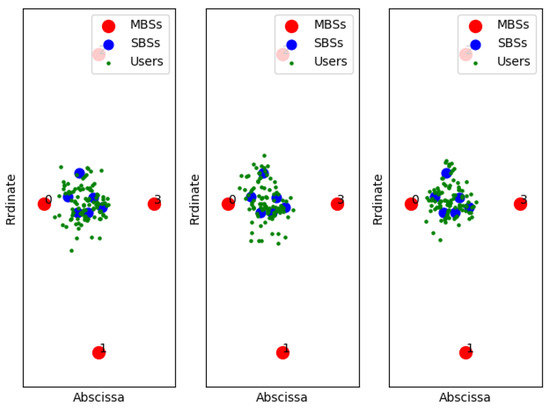 The parameters of experimental simulation are set according to the 3GPP LTE-A HetNets framework [37], and the wireless channel is modeled as deterministic path loss attenuation and random shadow fading models. In this part, the scenario we deployed is that each MBS covers the users in a 120° cell as shown as shadow part in Figure 4 and is interfered by three other MBSs. We deployed a field where six SBSs are randomly deployed within the coverage of the MBS in the green shaded part of Figure 4 and select working mode according to load conditions.