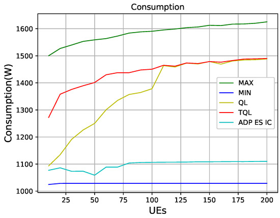 Figure 14 shows that QL, TQL, and the ADP ES IC algorithm in [9] optimize the power consumption of HetNets. We can see that, under the condition that the number of users being less than 100, the power consumption obtained by the QL algorithm is lower than the TQL proposed in this paper. However, when the number of users is greater than 100, the power consumptions of the two algorithms are the same, which are between the maximum power consumption and the minimum power consumption. The algorithm of ADP ES IC optimizes the power consumption best in the case of 50 users, and it is seen in Figure 14 that the power consumption control of the entire system is better than QL and TQL in the entire 10–200 users interval. However, it can be seen that such good results is obtained at the premise of sacrificing energy efficiency in Figure 15.