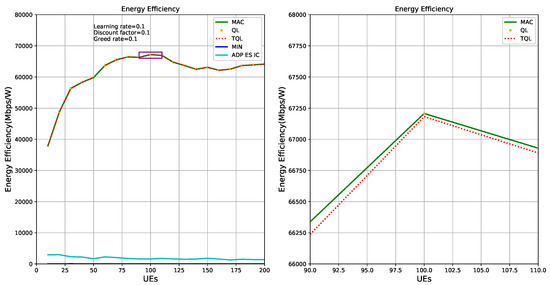 Figure 15 shows the energy efficiency of HetNets is optimized by QL, TQL, and ADP ES IC algorithms, respectively. Green solid line and red dotted line represent the theoretical optimal energy efficiency and the energy efficiency obtained by our TQL algorithm, respectively. The sub-picture on the left of Figure 15 shows that the optimized energy efficiency of our TQL algorithm is very close to the theoretical optimal, and the sub-picture on the right of Figure 15 shows that the index of energy efficiency of our algorithm optimization system is slightly lower than the theoretical optimal. According to the analysis of Figure 6, because the TQL algorithm has not found the optimal solutions (i.e., Pico BS, ABS, and CRE configuration) in some states, the gap exists between theoretical optimal and TQL algorithm, as shown in the sub-picture on the right of Figure 15. However, Figure 15 proves that the TQL energy efficiency performance is very close to the theoretical optimal energy efficiency, indicating that the TQL algorithm proposed in this paper has not been optimized in some states, but the solution found is also a relatively optimal solution, which may be a suboptimal solution. For the system, the performance loss is small. The ADP ES IC algorithm is poor in energy efficiency optimization, mainly because the authors focus on power optimization of the system in HetNets.
