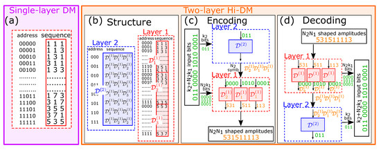 In the rest of this section, we provide two toy examples to illustrate the Hi-DM concept, we define the general structure and the notations, we describe the encoding and the decoding algorithms, and, finally, we give some basic rules to determine the main properties (i.e., rate, output probability, entropy, and energy) of the Hi-DM structure.