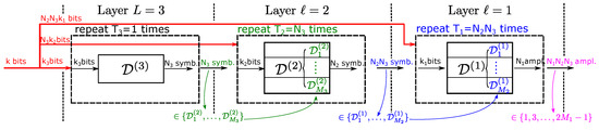 The word symbol indicates a DM when and an amplitude when . The procedure starts from the top layer, which takes the first input bits and generates the sequence of symbols (DMs), , with . This sequence of DMs is then used in the th layer to map the next bits to the symbols (DMs) to be used in the next lower layer—each DM mapping bits to symbols. The method is then iterated for the remaining layers, , being the number of total symbols generated by the ℓth layer. In particular, when the first (lowest) layer is reached, the sequence of DMs selected by the second layer maps the last input bits on the output amplitudes from the alphabet —each DM mapping bits on amplitudes. An example is shown in Figure 2c.