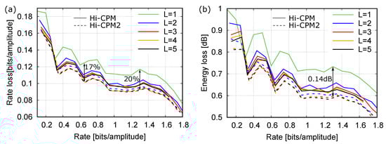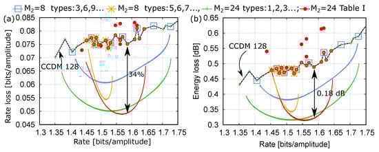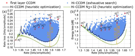 Figure 7a,b show similar results, but considering longer CCDMs on both layers () to achieve lower rate and energy losses. The rate (and energy) loss obtained with single-layer CCDMs designed for different target rates is shown with a dashed black line. On the other hand, the performances of the two-layer Hi-CCDM structures are reported with solid colored lines. Each line corresponds to a different set of CCDMs used in the first layer, with rates and rate losses indicated by the symbols with the same color, while the CCDM type in the second layer is optimized by using the heuristic procedure described above.