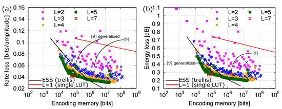 In particular, Figure 8a reports the rate loss versus the encoding memory, whereas Figure 8b reports the energy loss versus the encoding memory. In this case, since all the structures are built to minimize the mean energy per symbol, the two performance metrics yield equivalent results. The encoding memory required by the Hi-LUT (and single-layer LUT) structures is given by Equation (19). On the other hand, the ESS encoding memory is that required to store the trellis [11]. Indeed, as mentioned in the Introduction, the ESS approach uses a trellis structure to map uniformly distributed sequences of k bits—that is, indexes from 1 to —to sequences of N amplitudes with energy , where the energy bound is selected as the minimum value for which at least sequences are available. Often, a larger number of sequences falls within . In this case, the optimal shaping is obtained by discarding some of the sequences with . This can be done by storing two trellises, one for the sequences with , and one for those with . In the following figures, the label ESS indicates this optimal method, and the required memory accounts for both the trellises.