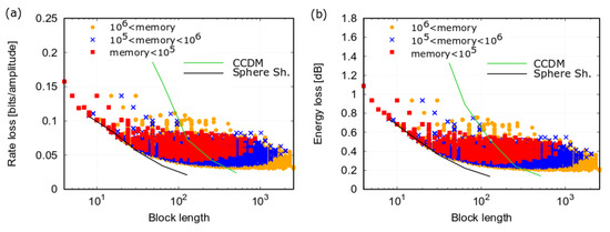 Finally, Figure 9a,b reports the same results shown in the previous figures—rate loss and energy loss, respectively, for —but as a function of the overall block length N. Different colors of the symbols correspond to different ranges of encoding memory Equation (19). The figures also report the performance for sphere shaping (e.g., obtained by ESS or LUT, as the implementation algorithm is not relevant in this case) and CCDM. Though the overall block length does not provide a direct indication of the implementation complexity, this figures reveal how efficiently the hierarchical structures select sequences of a given length with respect to sphere shaping, which is the most efficient packing solution. The figures show that (i) CCDM requires a much longer block length compared to sphere shaping to obtain the same performance [7], (ii) the Hi-LUT performance approaches that of sphere shaping for short block lengths, but deviates from it for longer block lengths, (iii) many Hi-LUT structures perform better than CCDM for the same block length, and (iv) the Hi-LUT rate loss decreases and approaches sphere shaping—the optimal packing solution—when a larger memory is allowed.
