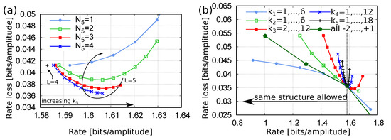 Figure 10a shows the rate and the corresponding rate loss that is obtained by adding an external layer to the four-layer structure. The figure shows the behavior for different values of and different rates, obtained with different . As expected, the rate loss is lower for larger . Interestingly, for fixed , the rate loss decreases down to an optimal value when increasing the rate (i.e., increasing ), reaches an optimal value, and then increases again. This is due to the trade-off between rate and entropy, both increasing when increases. Indeed, when starts to increase, the rate loss diminishes because additional bits are encoded. However, since the outputs sequences, when is too large, the DMs from the lower levels with large entropy (energy) are selected many more times, badly affecting the overall rate loss. This happens earlier for smaller because there are less possible combinations—they are —-and, thus, high-entropy DMs are chosen more often.