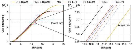 Figure 11a reports the GMI as a function of the SNR for a uniform-64QAM (U-64QAM) constellation and for a PAS-64QAM constellation with different DM implementations. In particular, we compare the Hi-CCDM with two layers, and , defined in Table 1 (solid blue) with the single-layer CCDM with comparable complexity, that is, with block length (dashed blue). Moreover, we compare the seven-layer Hi-LUT structure defined in the last line of Table 2 (solid red) with the ESS with (dashed red), which requires the same storage memory (but has higher computational complexity). All the DMs structures are optimized for a (one-dimensional) target rate bits per amplitude, which corresponds to a gross rate of bits per QAM symbol. For example, assuming an ideal FEC with rate , the information rate will be bits per QAM symbol [2]. Finally, the ultimate performance achievable with an ideal MB shaping with i.i.d. symbols (optimized for the same target rate) is reported as a reference. Figure 11b reports the same results as Figure 11a, but focusing on the performance around the target rate for which all the PAS systems are designed.