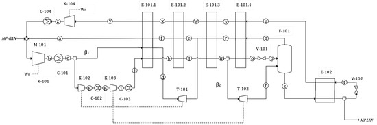 The diagram of the cycle is shown in Figure 2. It can be observed that it is a modified Collins cycle with four pressure levels: LP, MP, HP and HHP. The main forward flow is ‘c’-‘p’, cooled by the MP and LP return flows (“q”–“a” and “t”–“z”, respectively). The flows diverted to expander T-101, , and to T-102, , increase the cooling power of the MP return flow. The main expansion valve is V-101, flashing two-state N into the F-101 vessel. A subcooler after F-101 is required to adapt the product for transportation. This is done with E-102 and a second expansion valve V-102.