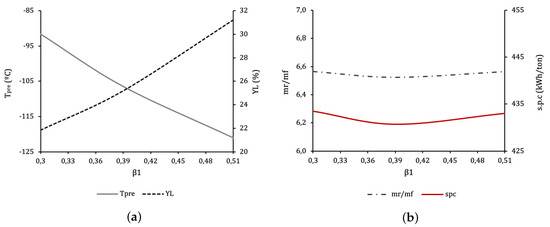 The results of the sensitivity evaluation are shown in Figure 8. It can be seen that the influence of the efficiencies of the compressor and the expanders is similar. This seems a logical conclusion, given that SPC is the result of the balance between the power consumed by K-101 and the power generated by T-101 and T-102. On the other hand, the influence of the MITA in E-101 is lower than that of the compressor and expanders for the range of values covered. This points to the heat exchange process discussed in the previous section. The temperature profiles at E-101.4 do not allow a good match, which will inevitably have a large temperature drop at E-101.4 inlet (states “m” and “r”), whose effect will dominate over slight improvements of MITA.