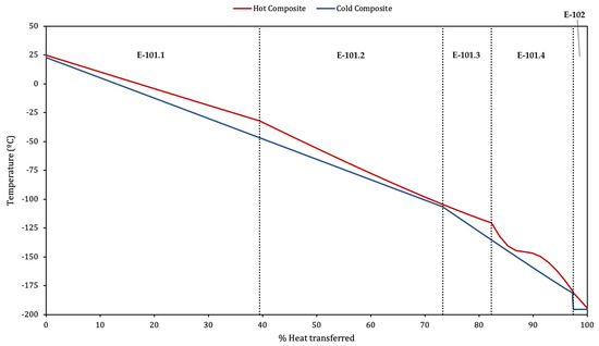 In E-101.3, the tendency is inverted again. The most relevant effect is the pinching of the temperature profiles that takes place at E-101.4. This phenomenon is also observed and explained in [7] for nitrogen at 40 bar, above the critical 33.9 bar. The pressure here is HHP = 36.0 bar, slightly closer to the critical. When the hot stream enters the exchanger at “m” (Figure 2), the heat capacity of the cold stream is much greater, so the temperature of the hot stream is more affected by the heat exchange taking place, decreasing steeply. This is the first converging stretch at E-101.4 in Figure 7. However, as the pressure of the hot stream is near the critical, minimal changes in temperature cause large changes of the specific heat. It rises steeply, achieving a maximum at −146 C. The increase of specific heat equals an increase in the heat capacity of the stream, explaining the diverging stretch. As the temperature decreases further from that point the specific heat will decrease steeply too, and with it the heat capacity of the stream, until it will be lower than the cold stream capacity. Temperature profiles will converge again, as at the initial section.