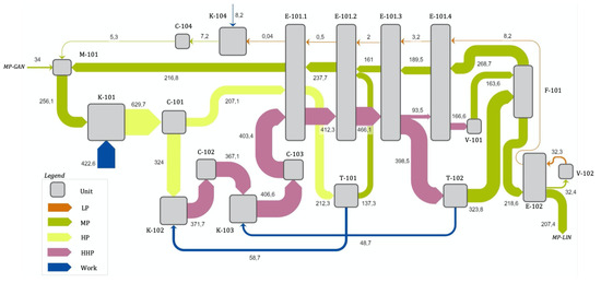 The liquefaction cycle analysed here can be taken as a control volume with one nitrogen input, MP GAN, and one output, MP LIN, referring to Figure 2. The minimum exergy required for the process would be the difference in flow exergy between these two states: 173.4 kWh/ton. This is achievable by the blue path [7] in the chart for nitrogen shown in Figure 3, which consists of an isothermal compression and an isentropic expansion, both reversible thus having zero exergy destruction, but technologically impossible. The real process has also been represented in the figure. The exergy analysis developed in Section 3.3 will compare both processes.